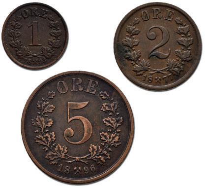 Sett med 1, 2 og 5 øre fra Oscar II. Varierte årstall, stort sett kvalitet 1+, noen med bedre år i lavere kvalitet. Katalogverdi ca. 375 kr eller mer.