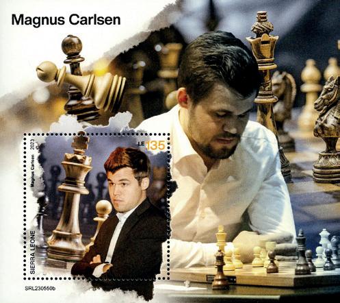 2 miniark fra Sierra Leone, utgitt i 2023. Det ene med 4 merker med bilder av Magnus Carlsen i ulike situsajoner ved sjakkbrettet opp gjennom årene. Det andre, med ett merke, viser også Magnus Carlsen ved sjakkbrettet, både på merket og utenfor. Postfrisk.