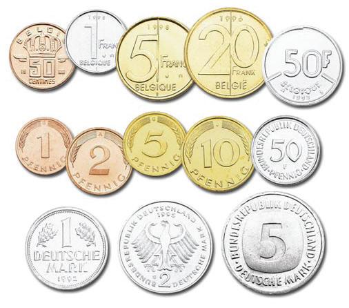 De siste myntrekkene før euro ble innført. Belgia og Tyskland med hhv. 5 og 8 mynter.
