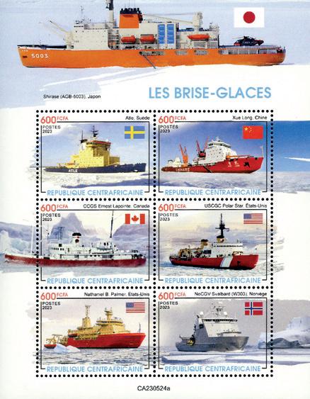 To miniark med isbrytere, begge med 6 merker der det ene merket viser kystvaktskipet “Svalbard” i isen. Ett miniark fra Den sentralafrikanske republikk og ett fra Sierra Leone, begge utgitt i 2023. Postfrisk. Best.nr.: N0625