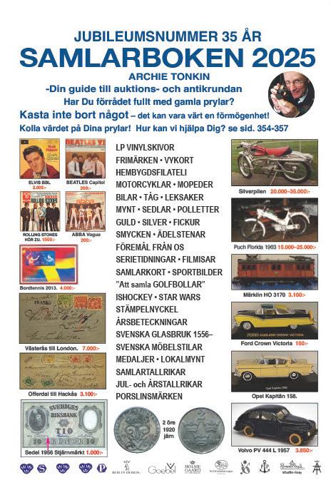 Sverige - Samlarbokaen 2025, 35. utgave, utgitt av Archie Tonkin. Denne katalogen er i A5-format med 400 sider og inneholder bilder, beskrivelser og priser på mange typer samleobjekter. I tillegg til frimerker, mynter og sedler finner du postkort, tegneserier, spillekort, golfballer, klubbnåler, fiskesneller, lekebiler og tog, mumietroll-kopper, juletallerkener, og mye annet, alt med priser. En spennende katalog å bla i, den kan gi deg ideer om nye og kanskje ukjente samleområder. 375,- 375,-