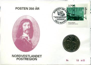 12 myntbrev utgitt i anledning Posten 350 år i 1997. Konvolutter fra ulike postregioner. Alle frankert med ett merke fra frimerkeheftet NK 1295/1302 og stemplet med særstempel fra postregionen 16.4.1997. Innsatt 5 kr minnemynt “Posten skal fram” 1997. Utgiver Fredrikstad filatelistklubb. Opplag 50 sett.