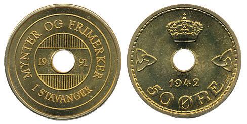 Polett av 50 øre 1942 Londonutgaven, laget til mynt- og frimerkemessen i Stavanger i 1991.