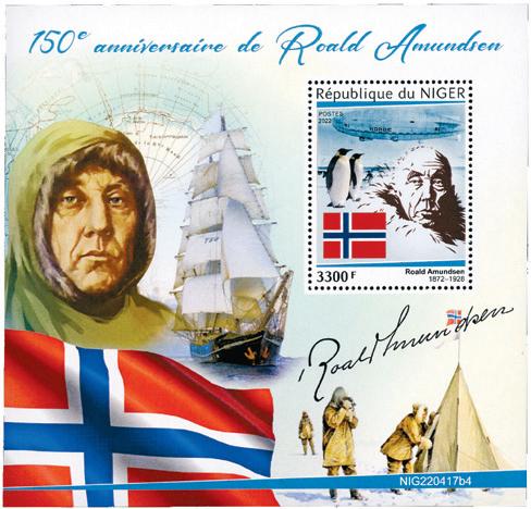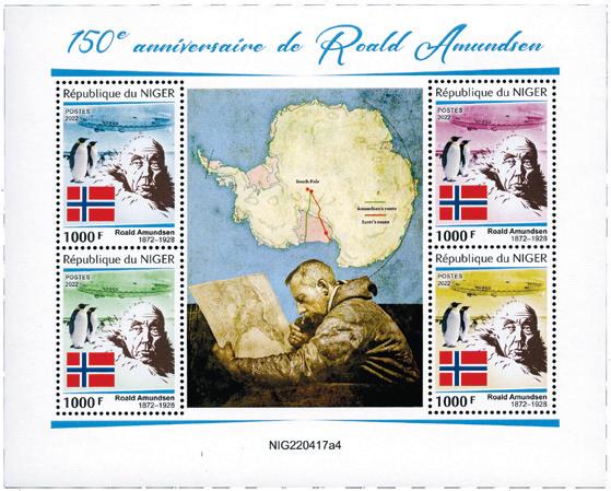 2 miniark fra Niger, utgitt i 2022 i forbindelse med 150 årsjubileet for Roald Amundsens fødsel.. Det ene med 4 merker som bl.a. viser kart over Sydpolen med rutene til Amundsen og Scott. Det andre, med ett merke, viser bl.a. portrett av Amundsen og teltet på Sydpolen Postfrisk.