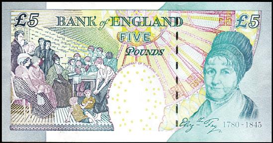Dette er den siste 5 punds papirseddelen utstedt av Bank of England før overgangen til polymerteknologi. Den ble først utstedt i 2002 og viser Elizabeth II samt Elizabeth Fry (1780–1845). Den britiske aktivisten og reformatoren kjempet for en mer human behandling av fengselsinnsatte og var i stor grad ansvarlig for tilsvarende endringer i loven. Hennes prestasjoner ga henne kallenavnet “Fengslenes Engel”. Forsiden viser et portrett av dronningen og et hologram med den nasjonale allegorien Britannia. Baksiden viser et portrett av Fry samt en scene der reformatoren leser for innsatte i Newgate fengsel i London. Leveres i folder med informasjon på engelsk.
