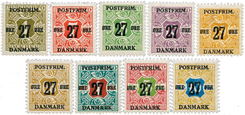 9 forskjellige 27-øres provisorier på avisportomerker, 1918. Postfriske.