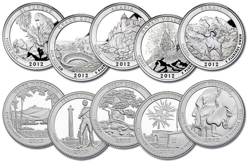National Park Quarters, 2012-13. 20 mynter i UNC kvalitet. 5 mynter for begge årene preget i Denver (D) og Philadelphia (P). Normalpris 200,-.