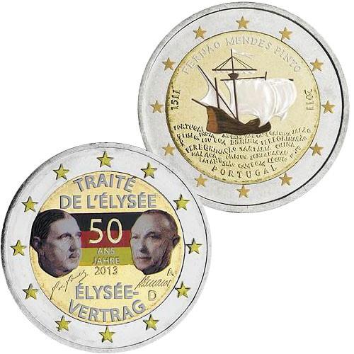 2 euro 2013 fra Tyskland og 2 euro 2011 fra Portugal. Begge i farger og leveres i kapsel. Normalpris 200,-.