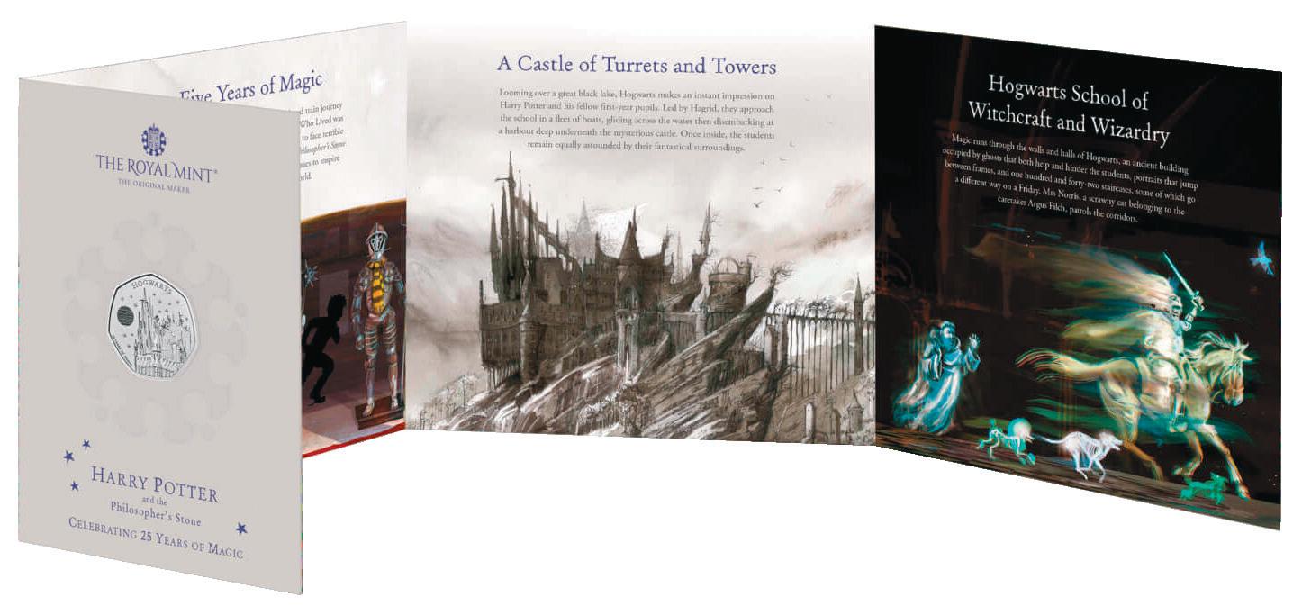 I 1997 publiserte Bloomsbury Children’s Book Harry Potter and the Philosopher’s Stone. 25 år etter lages denne 50 pence mynten for å hedre J.K. Rowling sin magiske verden. Baksiden er laget av Jim Kay, som er kunstneren som laget illustrasjonene til den første boken.