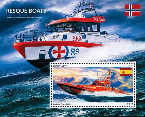 2 miniark fra Sierra Leone, utgitt i 2022. Det første er med ett merke som viser Stabben fyr utenfor Florø. Det andre med ett merke som viser en spansk redningsbåt, har Redningsselkapets båt “RS 163 Kristian Gerhard Jebsen II” i full fart som sidemotiv. Postfrisk.
