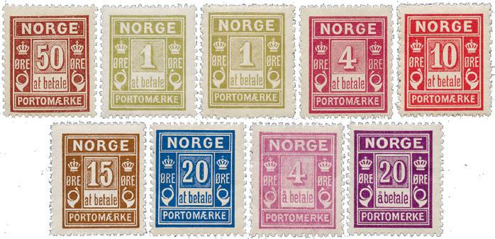 9 postfriske portomerker: P 5X, 8a, 8b, 9Yb, 10X, 11, 12X, 13b og 18. Et par med litt flisetagging, ellers god kvalitet.
