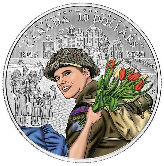 10 dollar 2020, sølv farget. Liberation of the Netherlands. 75 år siden frigjøringen av Nederland. Her blir det delt ut tulipaner i gledesrus.