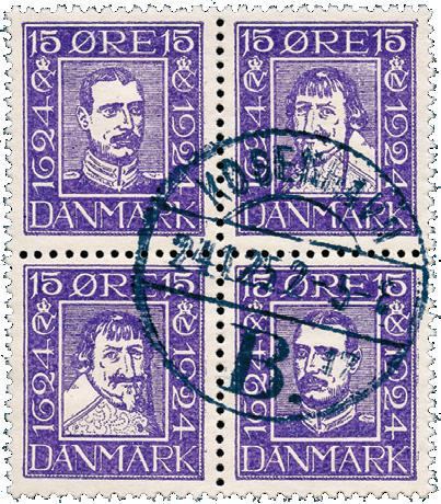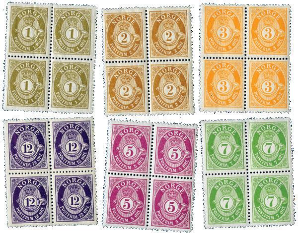 Postfriske 4-blokker 1, 2, 3, 12, 5 og 7 øre posthorn 1909/29. NK 96-98, 101, 118-19.