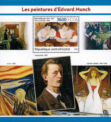 To miniark fra Den sentralafrikanske republikk, utgitt i 2021. Det ene med 4 merker og det andre med ett merke. Begge viser kjente Munch-malerier, bl.a. “Skrik”, “Det syke barn” og selvportrett. Postfrisk.