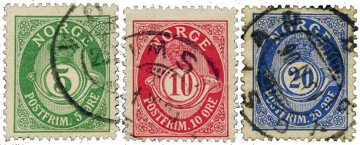 5, 10 og 20 øre fintg. Knudsen 1898/1908 med stående vannmerke. Stemplet. NK 76Y, 77IIY og 79Y.