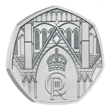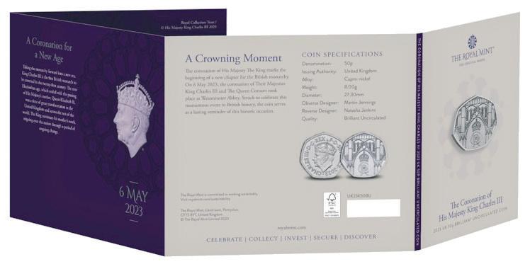 50 Pence utgitt i forbindelse med kroningen av Kong Charles III. Kvalitet B.U. Leveres i folder med informasjon om begivenheten.