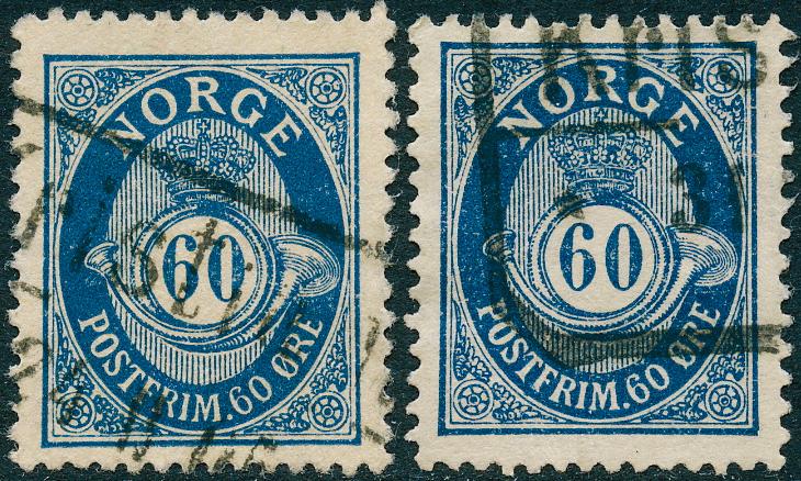 60 øre med både liggende og stående vannmerke. Pakkestemplet. 150,-