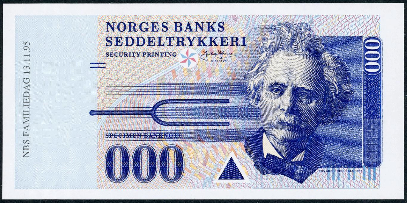F 1163 Spesialtrykk fra Norges Banks seddeltrykkeri. Utgitt til besøkende “NBS FAMILIEDAG 13.11.95”, med 500 kr seddel som grunnmotiv. Kvalitet 0.