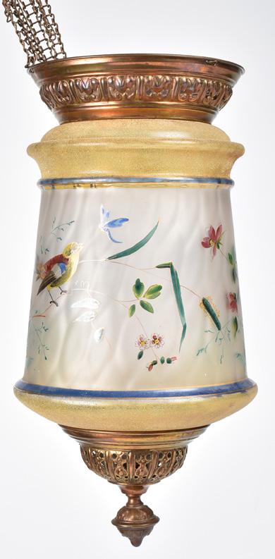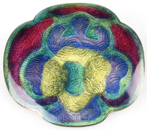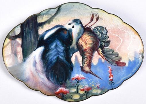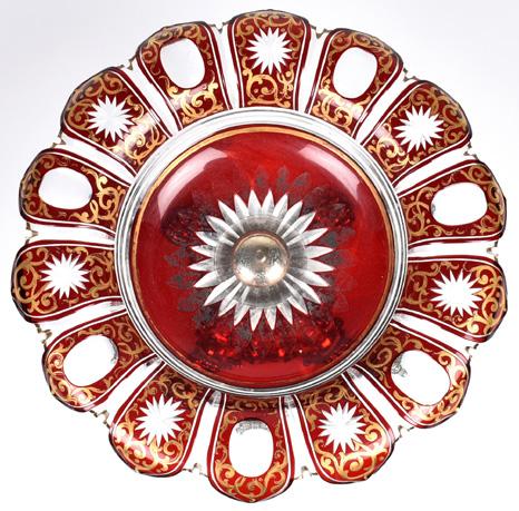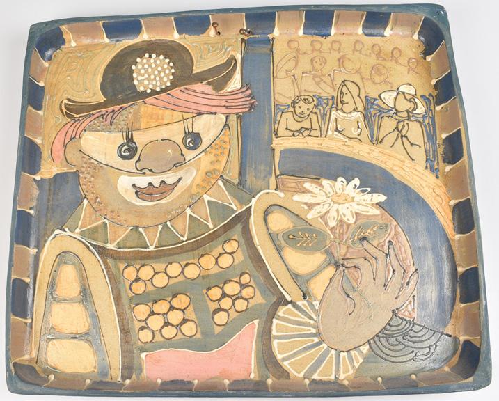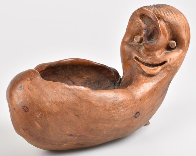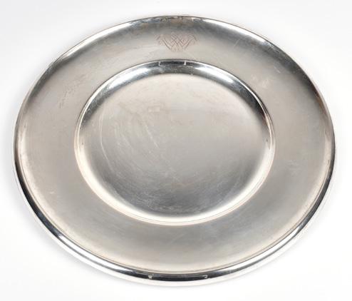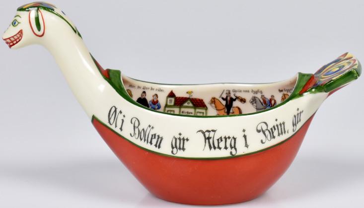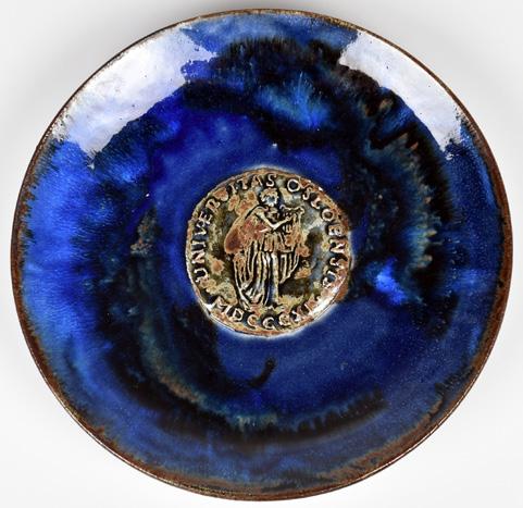 2079 PRYDFAT. Bjerk, sent 1800-tallet/ca. år 1900. Dreiet, rund skive i bjerk med svidekorert og fargesatt dekor. Motiv av riksløven av 1844-typen, så trolig like før Unionsoppløsningen i 1905. Øvrig rankeverk og perlerand. Bruksspor, noe smuss og en /tørke)sprekk. Oppheng i bakkant. Ø: 42 cm.