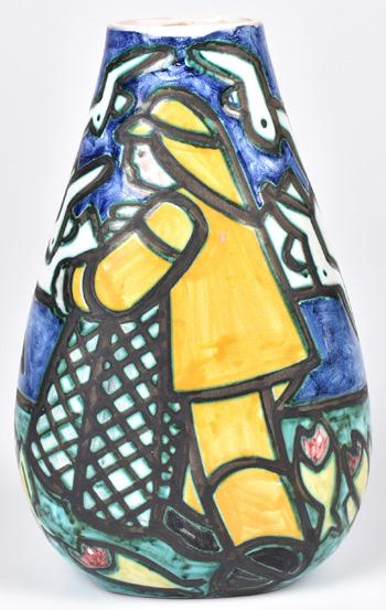 2097 TELEVIMSENFIGUR. Televimsen med tv-apparat og gitar. Ikledd rød jakke. Pen figur med klistremerke fra Figurkunst Hauketo under. H=25,5 cm.