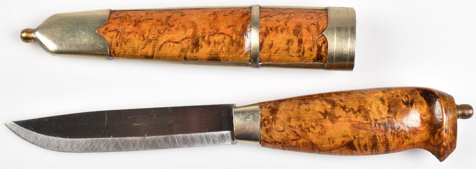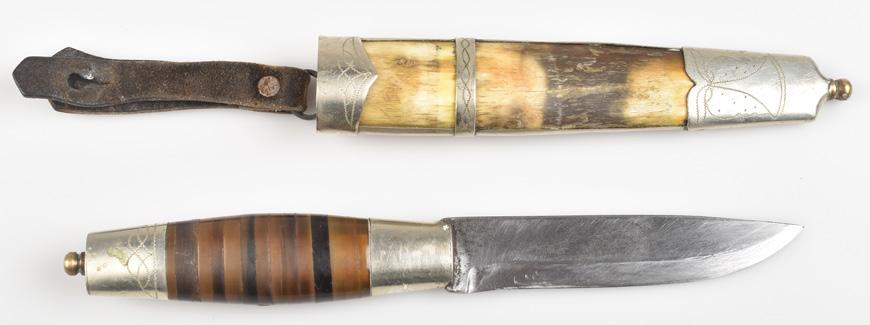 2092 STASKNIV. Eldre staskniv, sliren er laget av bein og tinn, kniven er umerket. L:20,5 cm, med slire: 22,2 cm.