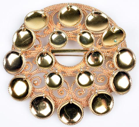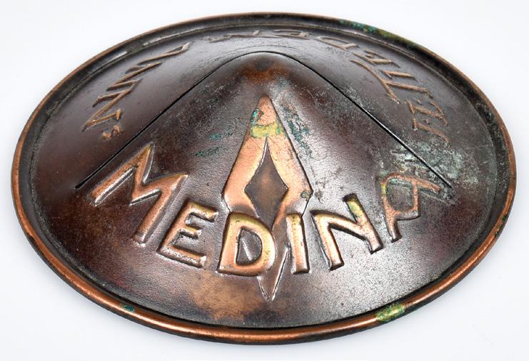 2090 SPAREBØSSE. Fin bøsse metall, formet som en stor 5-øring. Ø=11 cm og B=3,7 cm. Datert 1935. Mangler lokk med lås under.