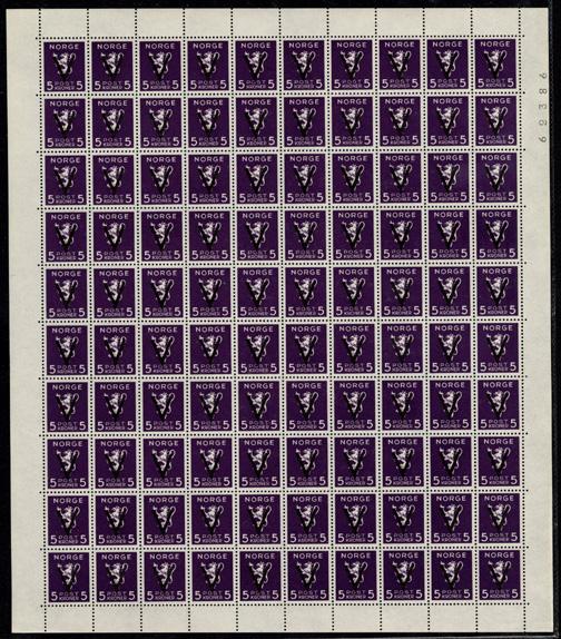 2142 292. 5 kr V-merke i postfrisk ubrettet helark á 100 stk. Stammer fra lageret som ble funnet på Slottet etter 2. verdenskrig (20000).