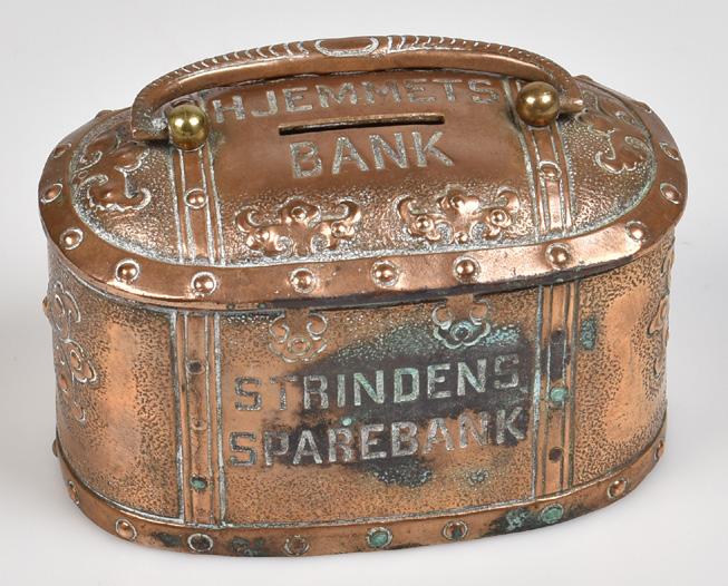 2093 STRINDENS SPAREBANK. «Hjemmets bank». Gammel og meget fin sparebøsse i messing, formet som en gammel kiste. Laget av H. Møllers metallvarefabrikk A/S Trondhjem. Ca. 12x7,5x8 cm. Mangler nøkkel og låsen er ikke låst.