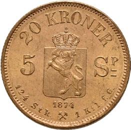 8 20 kr gull 1874, kv. 01. (AGW; 0.2592 oz./8,06 gram rent gull).