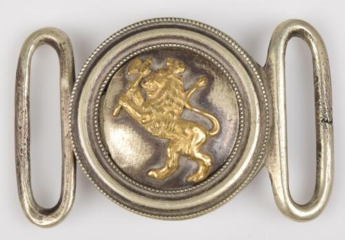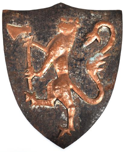 1630 OSCAR RIKSLØVE. Stort fint merke i messing. Ca. 5,5x 6,3 cm. Øksen brukket og borte.