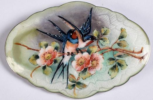 1628 NÅL. Fin emaljert nål i sølv fra Aksel Holmsen. Med britiske flagg oppe i venstre hjørne og RTF over vinger nede i høyre hjørne. Ca. 5x3 cm.