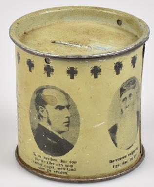 1645 SANTALMISJONEN. Innsamlingsbøsse i blikk. Med kart over India, bilde av to menn, ant. misjonærer, bibelsitater m.m. Ø=7,7 cm og H=7,6 cm. Ant 20-30årene. Pen stand, en liten bulk. Sjeldent utrop!