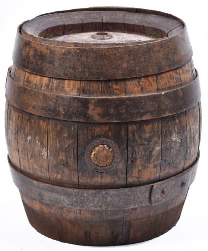 1468 ØL/VINTØNNE. Flott gammel tysk tønne laget i tre med kraftige naglede tønnebånd av jern. Merket «Schulteiss 40. 1262 NO Unverkauflich». 1 av 4 tønnebånd mangler, ellers fin patina. H:45cm Ø:35cm -I bunn og topp. Dekorativ til hjemmebaren eller vinkjelleren.