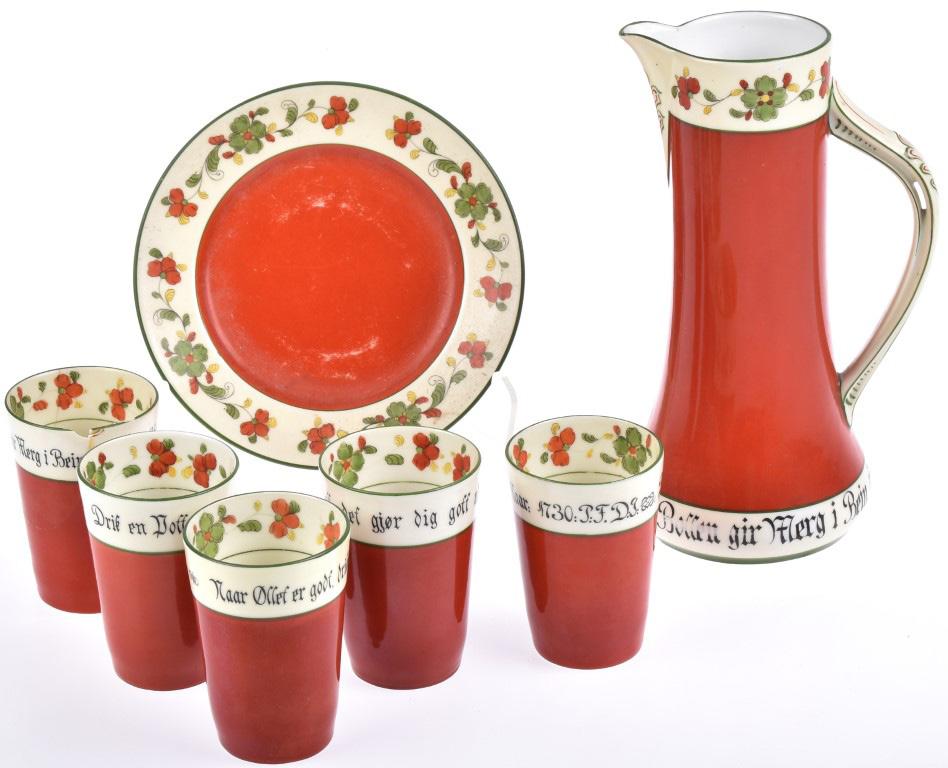 1464 VIKINGMOTIVER. «OSEBERG - SKIBET.O. Væring... 1907.» Originalfoto. Motiv: 20 x 14 cm. DRAGEKOPI i tre, håndskåret (Oseberg). H: 17 cm. VIKING I SMIJERN, m/ skjold og spyd. H: 31 cm. ASKEBEGER i tinn (Oseberg). Ø: 9 cm. HADELANDSVASE m/ vikingskip. H:18 cm. ASKEBEGER, keramikk. L: 11,5 cm. Alt brukt, men i pen stand. 1
