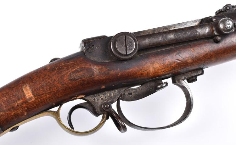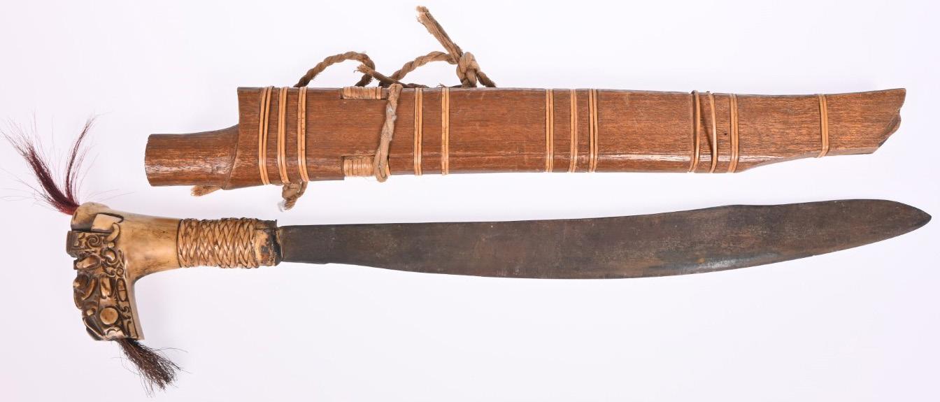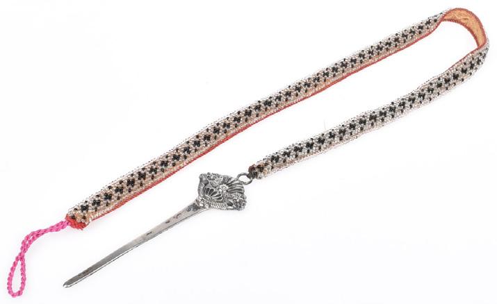 1460 SUKKERØKS 1800 - tallet, Telemark. Redskap til oppdeling av kjegleformede sukkertopper eller kandissukker i butikk og hjem. Utformet i jern med «slagtopp» og flat øks (H: 11 cm.) Utenpå trehåndtaket et sirlig utformet hylster i messingblikk m/akantusranker i flere felt. Brukt, men i pen stand. Uvanlig gjenstand. L: 24,5 cm.
