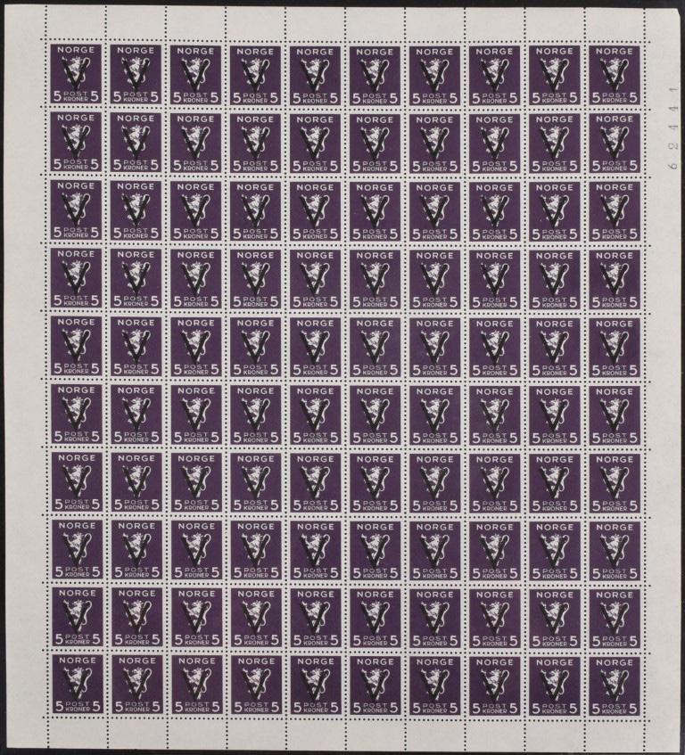 1510 292. 5 kr V-merke i postfrisk ubrettet helark á 100 stk. Stammer fra lageret som ble funnet på Slottet etter 2. verdenskrig (20000).