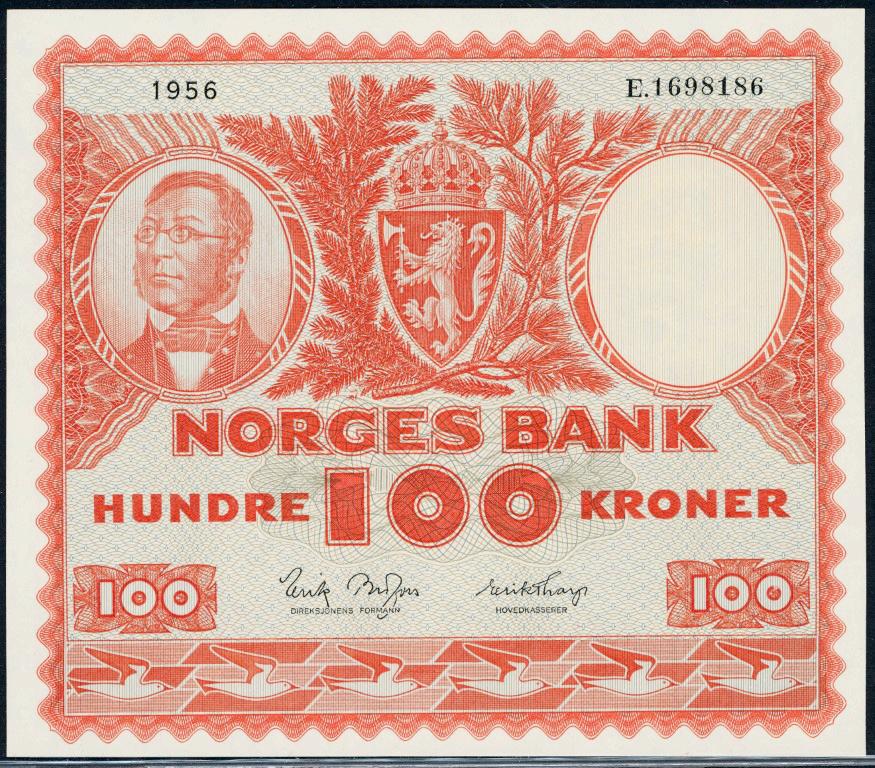 29 100 kr 1956 E, kv. 0. Sjelden å finne ubrettet og i så pen stand (3500).