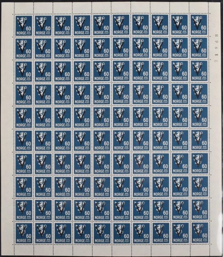 1506 288. 60 øre V-merke uten vannmerke i postfrisk ubrettet helark á 100 stk. Stammer fra lageret som ble funnet på Slottet etter 2. verdenskrig (5000). 1