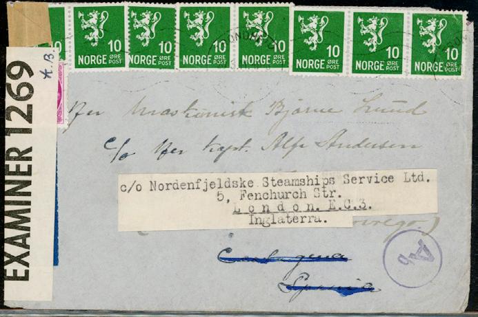 2682 o/**/Br Samling fra 2.verdenskrig i Leuchtturm-album med fokus på Londonmerkene på brev. Her finnes feltpostbrev, ilbud-expres brev, jernbanestempler, norsk skipspost Marinen, følgebrev, skotøykort Svolvær, Norwegian Army Field Post Office, Norsk skipspost i handelsflåten frankert med Londonmerker i 4-blokker. Litt røyklukt kjennes fra albumet. Samlingen montert med litt annet “krydder”. 1000