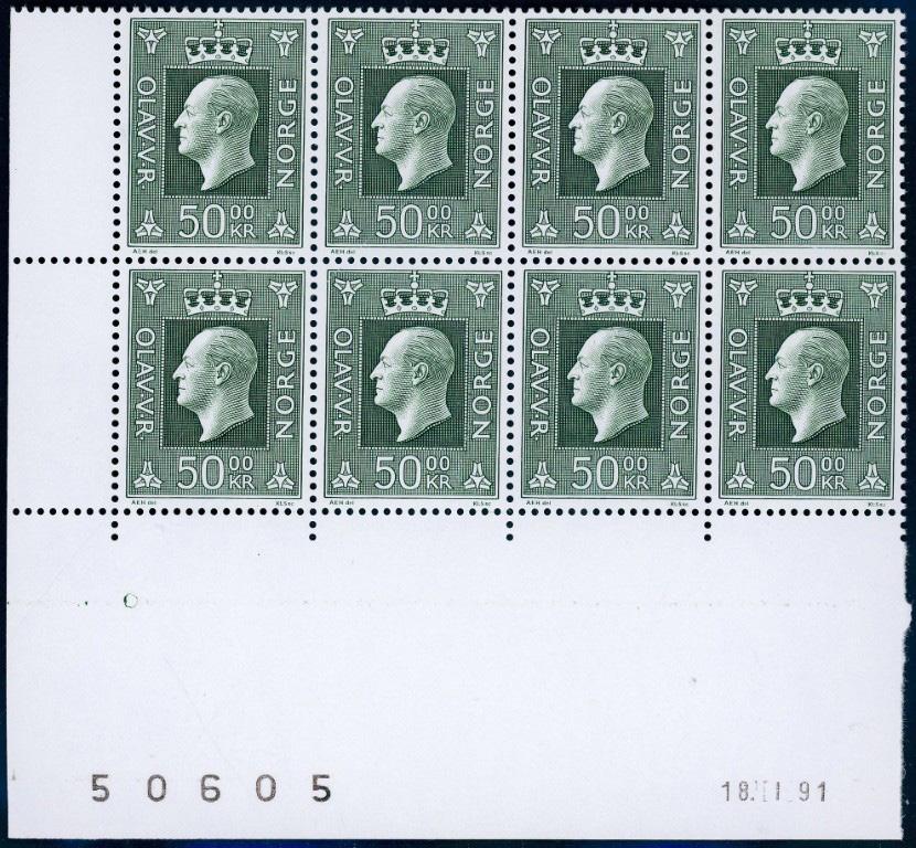 2652 o Fyldig samling til 1989, med alle skillinger uten NK 7, og bra på stolpe, mens gode kroneverdier mangler. Var. kvalitet i eldre del, men de fleste på eksempelbildet ok/bra. Noen få under krigen med “uklare” stempler, ellers på det jevne i mest lettstemplet kvalitet. Ark og merker TM/PM er ikke med.