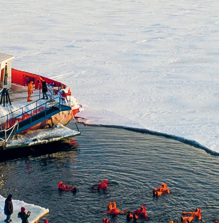 Die wordt compleet gemaakt door de mogelijkheid midden op zee (!) van boord te gaan en fantastische foto’s te nemen tegen de achtergrond van het schip. Maar het wordt nog beter als je zelf de ijszee in kunt springen. Wél in een soort Teletubbiepak, want anders is het niet te doen natuurlijk. Eenmaal in dat pak gehesen voel je de kou niet én blijf je moeiteloos drijven tussen de ijsschotsen. Echt uniek. Brändön Lodge