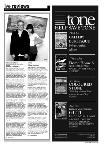 Tone Thursday September 8 Tiger Choir are a young group from Hobart who are trying to be too many things to too many people. They certainly mean well enough, but with a sound that seems to swing between the aesthetic of every popular triple j act of the last four years (see: Oscar + Martin, The Drums, Gypsy & The Cat), a drum machine that doesn’t sit at all well with their live drummer and some pretty subpar mixing, they’re not pleasing many tonight. When they find their own sound, they’ll be something to witness, but right now they’re nothing too remarkable. Also, someone forgot the volume control – their set is double the decibels of the headliners. Like their support, Songs are having a bit of an off night too, but it’s mostly beyond their control. Tonight’s meant to be the big debut of their new band 2.0 after the first lot vamoosed and left bassist Ela Stiles and guitarist Max Doyle without anyone to kick out the jams. Their new backing guitarist (and Songs’ tunes really do rely on the interplay of guitar sounds) has gone and had his baby born – completely unprofessional – which leaves them one man down, and with Ela losing her voice. Despite all that, they power through a bold set that’s made up almost exclusively of new material from their forthcoming sophomore album. But while the music is fresh and new, nobody has any idea what they’re listening to. Half of this stuff matches the driving minimal psych aesthetic they championed on their debut, particularly new single ‘Heavy’, which brings back all kinds of Bait-ShopIn-The O.C. vibes with its insistent bass pulse. Unfortunately, Songs rely on a gradual build up of tension based on repetition, and that’s something Max can’t do by himself when his wingwoman is sick and his other axeman unavailable. Some of the tracks plod without going anywhere and become a bit same-y, but others fare a lot better. The inclusion of keyboardist Jules Ferrari is welcome, particularly as she backs Stiles up with harmonies that match the minor-key sentiment of the music perfectly. But it’s not the best set from Songs, and even Max acknowledges that: ‘Come see us next time when we’re better.’ Sounds like a plan to us.