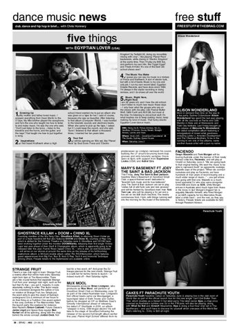 EGYPTIAN LOVER (USA) Kingdom’ by Twilight 22, doing my incredible mixing with vinyl – like playing ‘Planet Rock’ backwards, while mixing in ‘Electric Kingdom’ at the same time. Then I’ll play my 808 live, and perform my own hits, like ‘Egypt Egypt’ and ‘Freak-A-Holic’. It’s one of the best oldschool shows ever! The Music You Make I guess you can say my music is a mixture 4. of Prince and Kraftwerk. A sort of electro funk, but with a lot of beats. Music is my one and only job. I run my own record label, Egyptian Empire Records, and have done since 1984. I’m always in the studio recording or doing remixes, and I do shows all over the world. Music, Right Here, Right Now 5. I am 48 years old, and I love the old school.