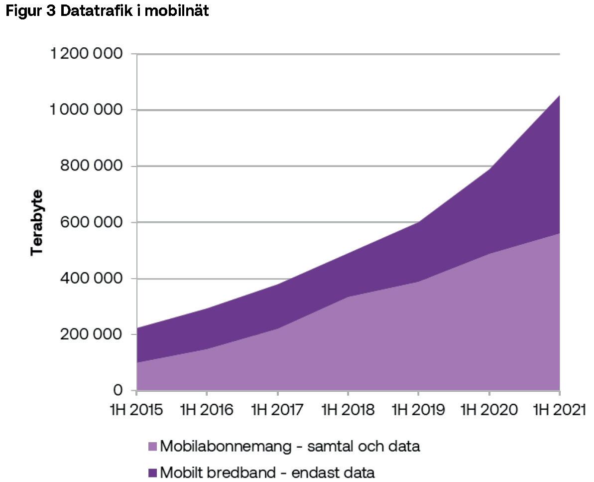 Datatrafiken i 5G-nät ökade kraftigt under första halvåret 2021, men utgör än så länge en liten del av den totala datatrafiken.