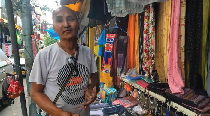 Opposite Page: An image of me interviewing an elderly stall owner (top) and a Tibetan male clothing stall owner (bottom).