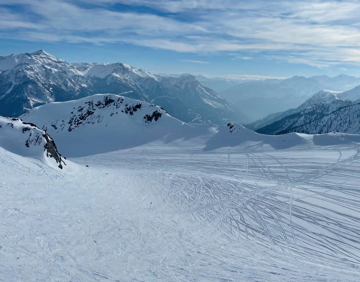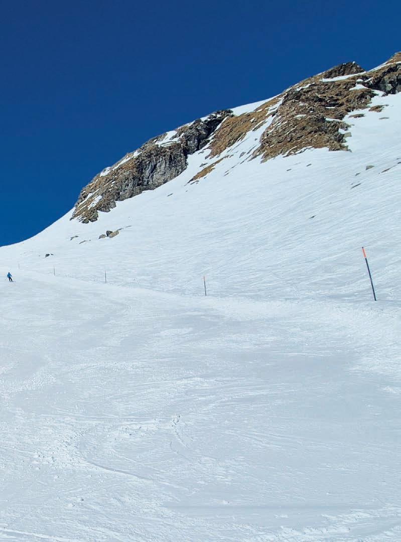 in the background. For consistently great conditions, he points to Les Vallons: “It’s a north-facing blue where the snow is always good, whether you ski in December or mid-April.”