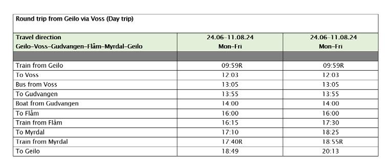 Round trip from/to Geilo via Voss with Bergen Railway, Flåm Railway, UNESO Nærøyfjord cruise, and a bus ride through Nærøy Valley