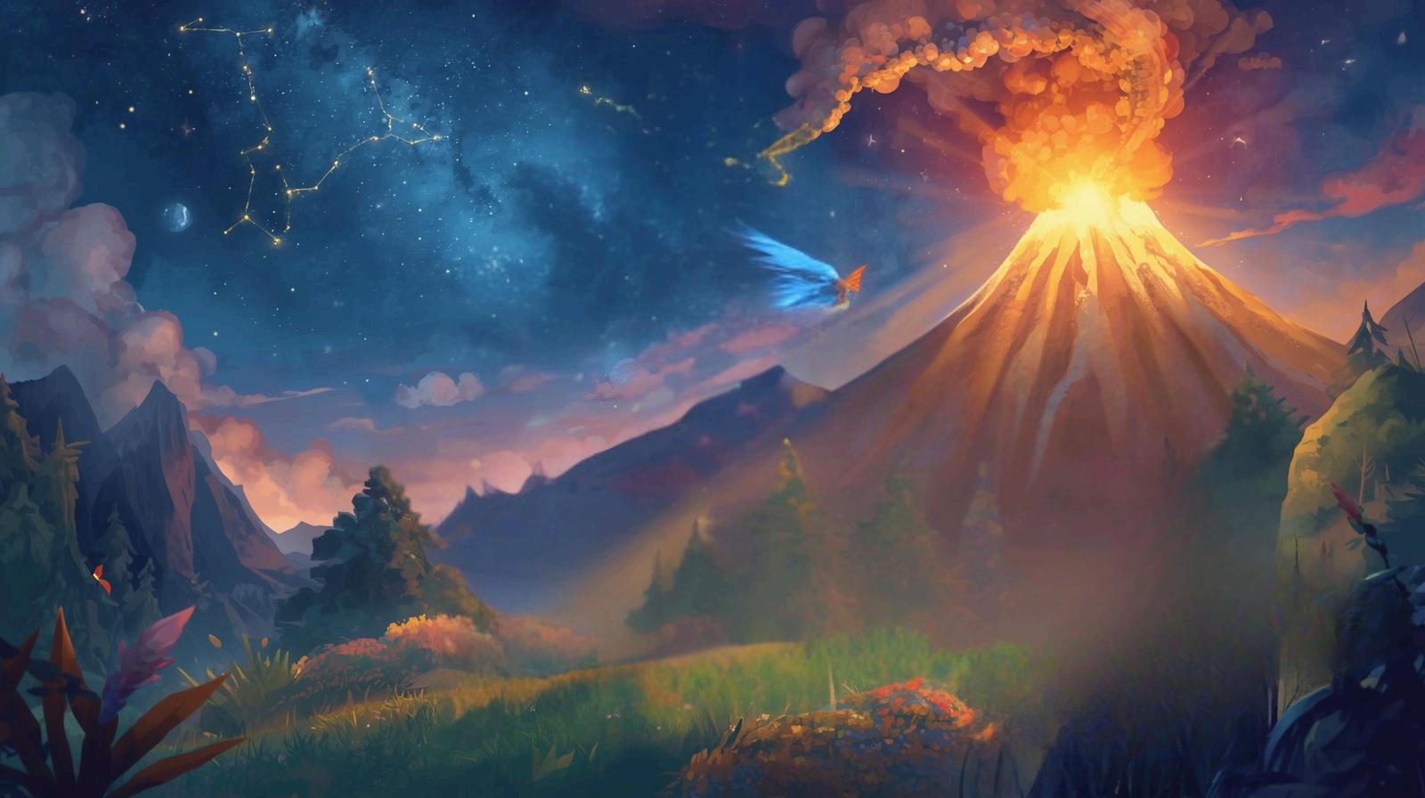 Con la ayuda de Lunaris, los dos hermanos dibujaron en el cielo un gran dragón de luz. Sus rayos iluminaron la montaña y el dragón de fuego, sorprendido, se calmó y se hizo amigo de ellos.