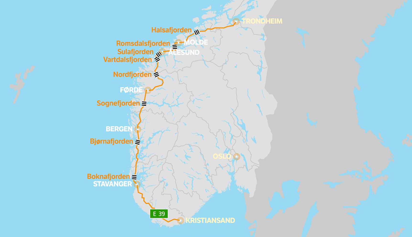 Figur 1. Oversikt over hele E39, med markering av fjordkrysningene. Illustrasjon: Statens vegvesen