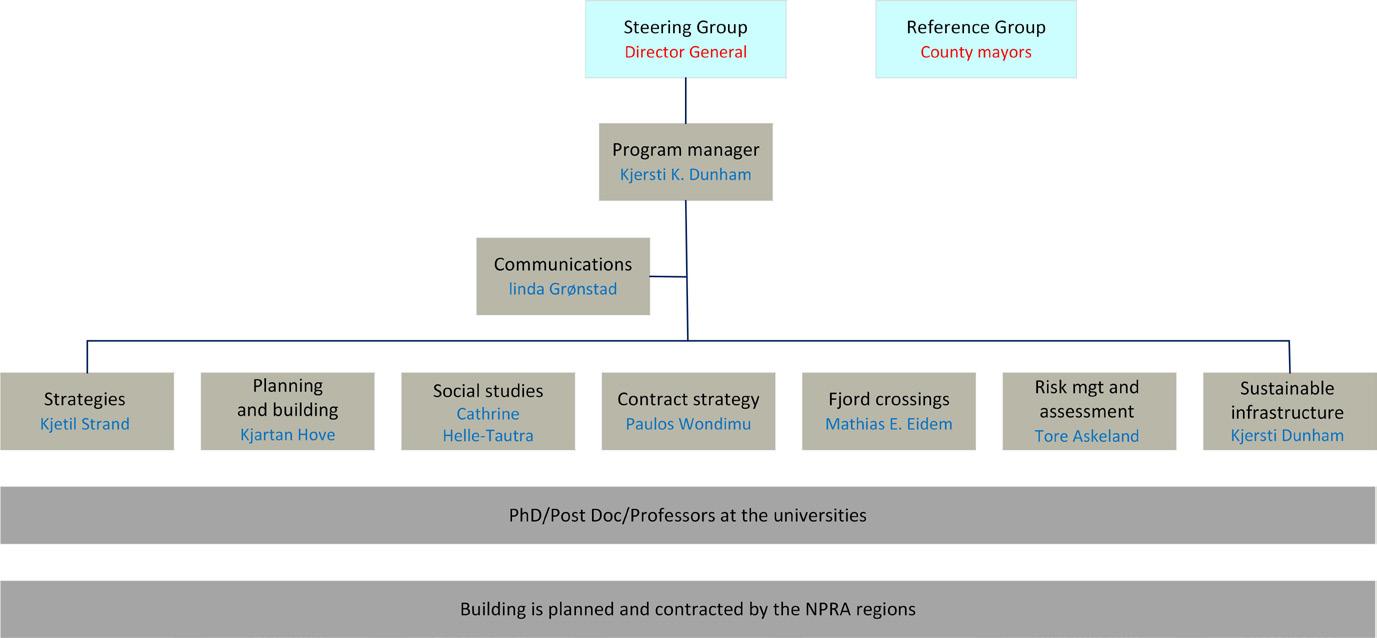 Styringen av prosjektet var lagt til Vegdirektoratet. Frem til 2020 ble Styringsgruppen ledet av Vegdirektøren, og alle regionvegsjefene som ble berørt (Midt, Vest, Sør) deltok i styringsgruppen. I referansegruppen satt alle berørte fylkesordførere og deres samferdselsledere. De enkelte delprosjektene var ledet av personer rundt om i hele organisasjonen; utbyggingssjef i Region Vest, strategisjef i Region Midt og medarbeidere fra både styringsstaber og tekniske avdelinger. Et eksempel på organiseringen, fra 2019, er vist i figur 4.